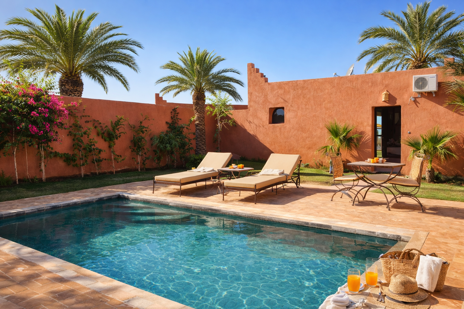 De construction récente et inspiré de l’architecture traditionnelle marocaine, le domaine offre un cadre chaleureux, spacieux et confortable, propice au partage et aux souvenirs inoubliables. Entièrement sécurisé, avec un portail fermé et un gardien présent 24h/24, il garantit aux parents comme aux enfants un séjour en toute sérénité.