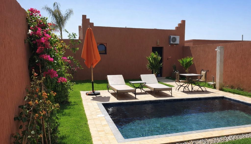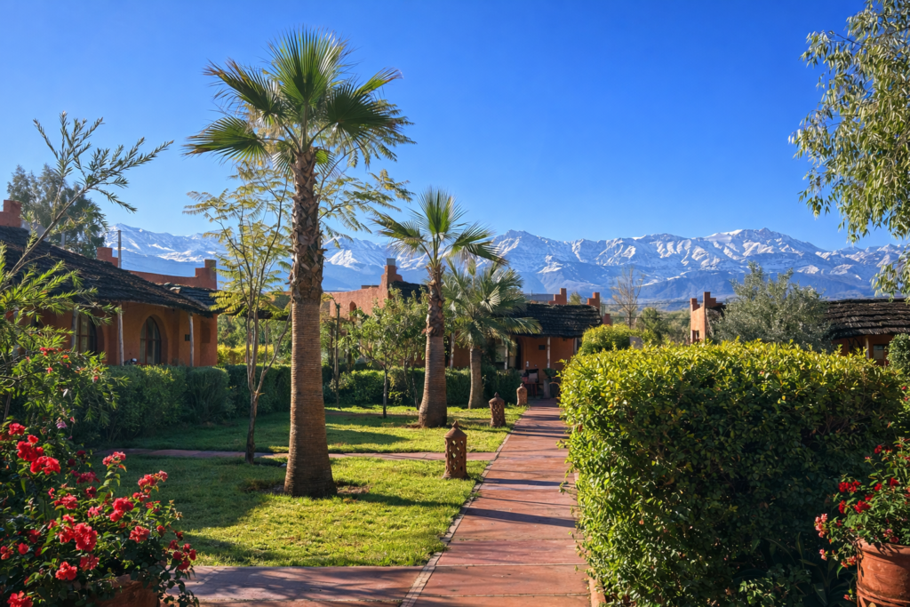 un hébergement premium, alimenté par des énergies 100 % vertes, intégré harmonieusement dans la nature préservée des Orangers de l’Ourika